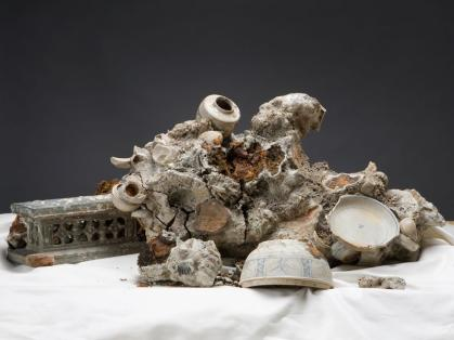 通过追踪这些物品的路径,从越南到海底再到旧金山,本次展览提出了艺术品是如何进入博物馆收藏的问题。这次展览的中心主题暗示了留在海里的文物的命运。这块灰色的石头上突出着陶器和其他工艺品,它曾经被藤壶覆盖着。现在,这个被称为结石的土堆正在慢慢瓦解,随着土堆的崩塌,隐藏在里面的东西其中包括一枚中国钱币、一对鹿角和海洋生物的遗骸也逐渐被发现
